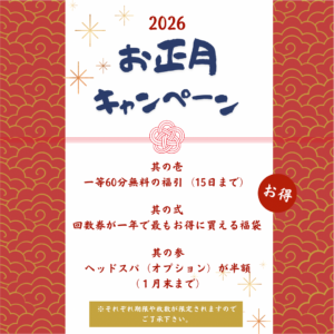 2026/01/04 今年も始まりました、お正月企画! 施術無料券やティータイムセットなど、当選確率の高い福引が15日まで。 枚数限定で販売する一年で最もお得に買える回数券の福袋。 人気のヘッドスパ&眼精疲労コース(オプション))が半額! 良い一年を過ごす為に、まずは体の調子を整えてからスタートしてみては如何でしょうか。 皆様のご来店を心よりお待ちしております。 1月生まれのあなたへ ページ一覧 HOME サロン案内 メニュー 初回キャンペーン Q&A お客様の声 ギャラリー 代表紹介 お問い合わせ プライバシーポリシー サイトマップ カテゴリー お知らせ 最近の投稿 今年もやります、ハッピースタート大作戦! 1月生まれのあなたへ 12月生まれのあなたへ 「インフルエンザ」1ヵ月で10倍に 秋の感謝祭「宝くじ」当選者発表! 1 シェア ツイート